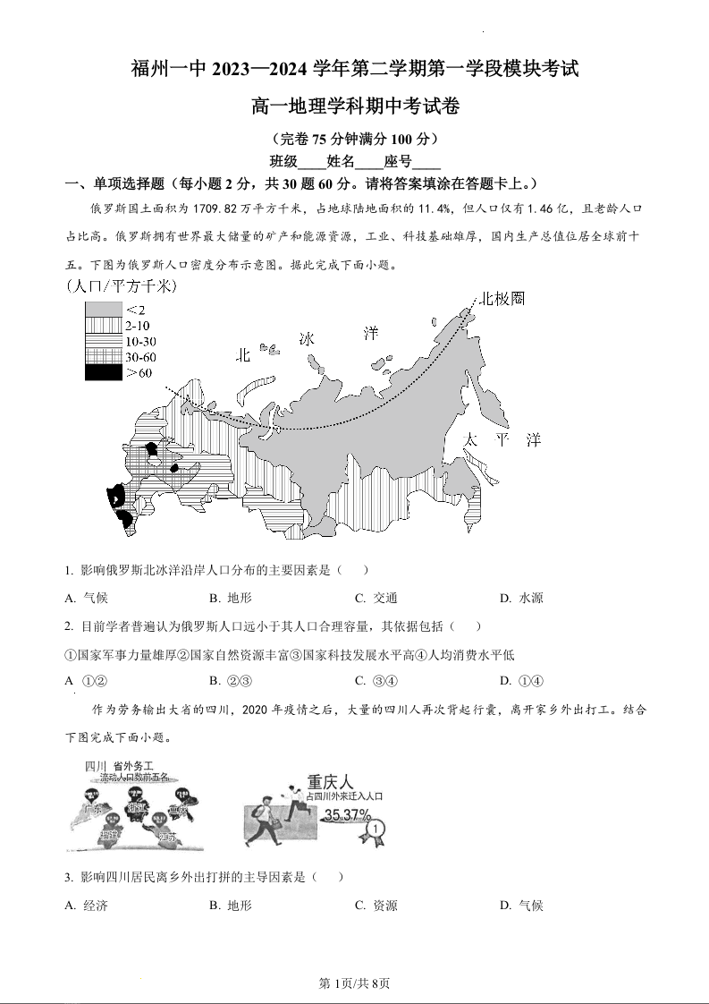 福建省福州市第一中学2023-2024学年高一下学期4月期中考试地理(原卷版)