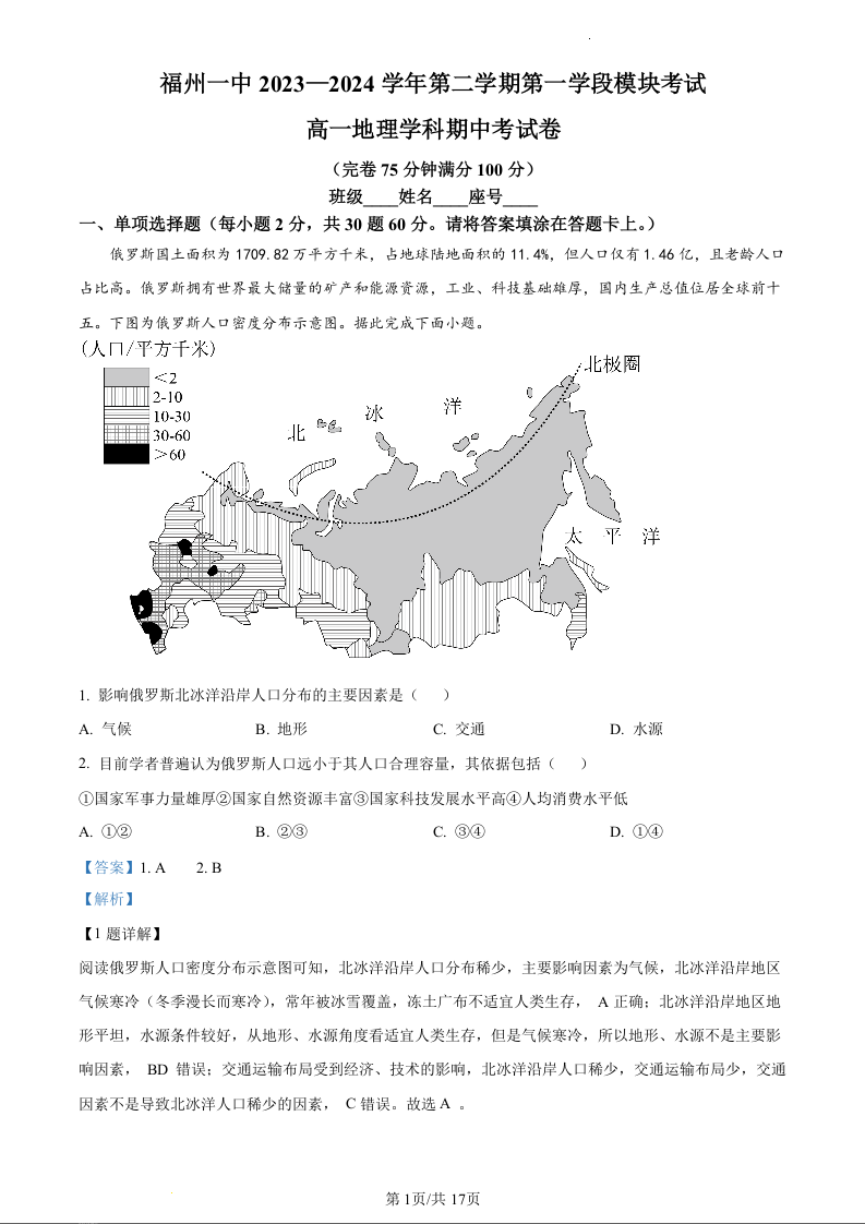福建省福州市第一中学2023-2024学年高一下学期4月期中考试地理(精品解析版)