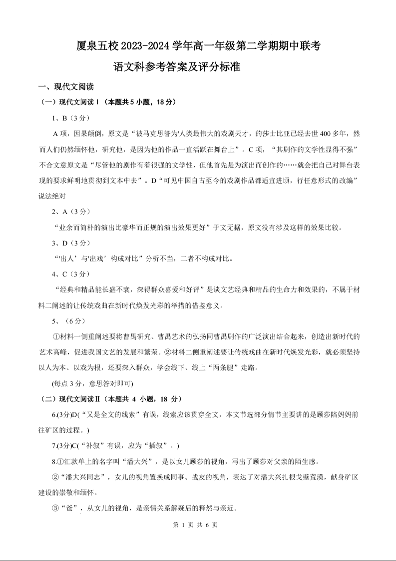 福建省四地五校联考2023-2024学年高一下学期4月期中考试语文答案
