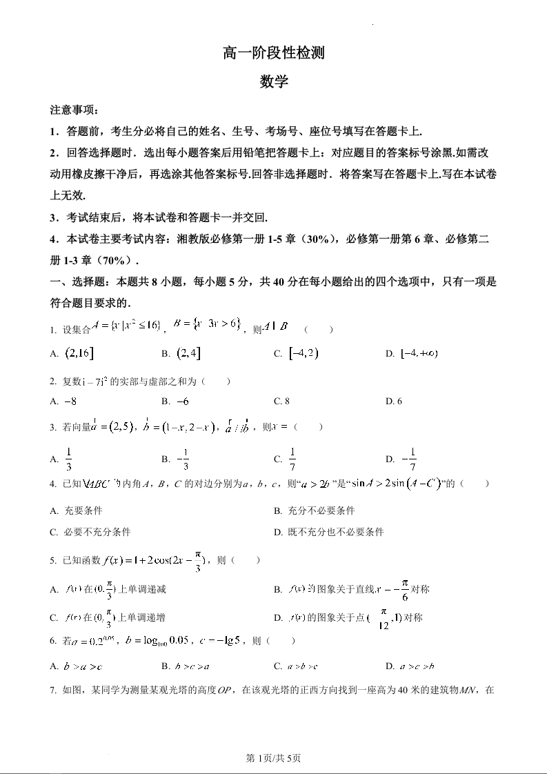 甘肃省白银市2023-2024学年高一下学期5月期中考试数学(原卷版)