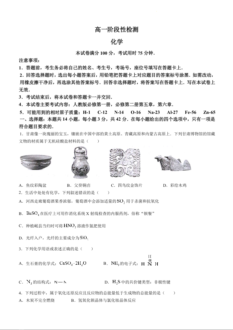 甘肃省白银市2023-2024学年高一下学期5月期中考试化学+答案