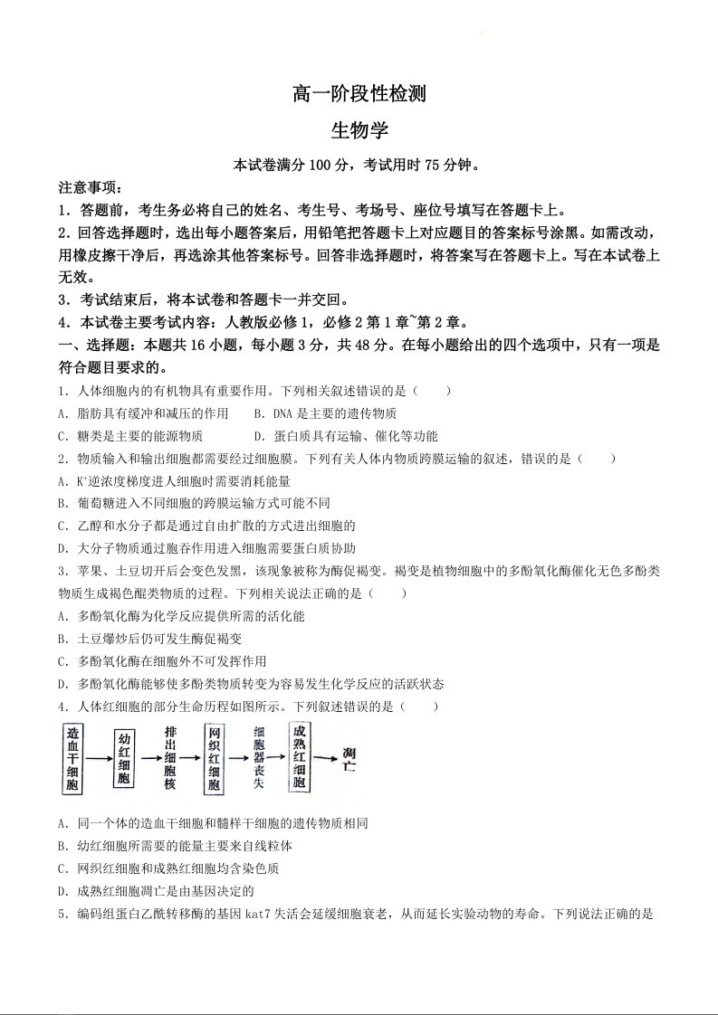 甘肃省白银市2023-2024学年高一下学期5月期中考试生物+答案