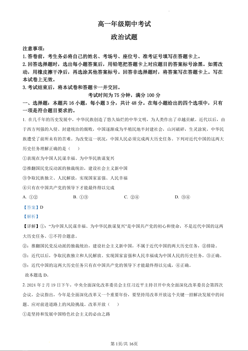 甘肃省酒泉市四校联考2023-2024学年高一下学期5月期中考试政治(精品解析版)