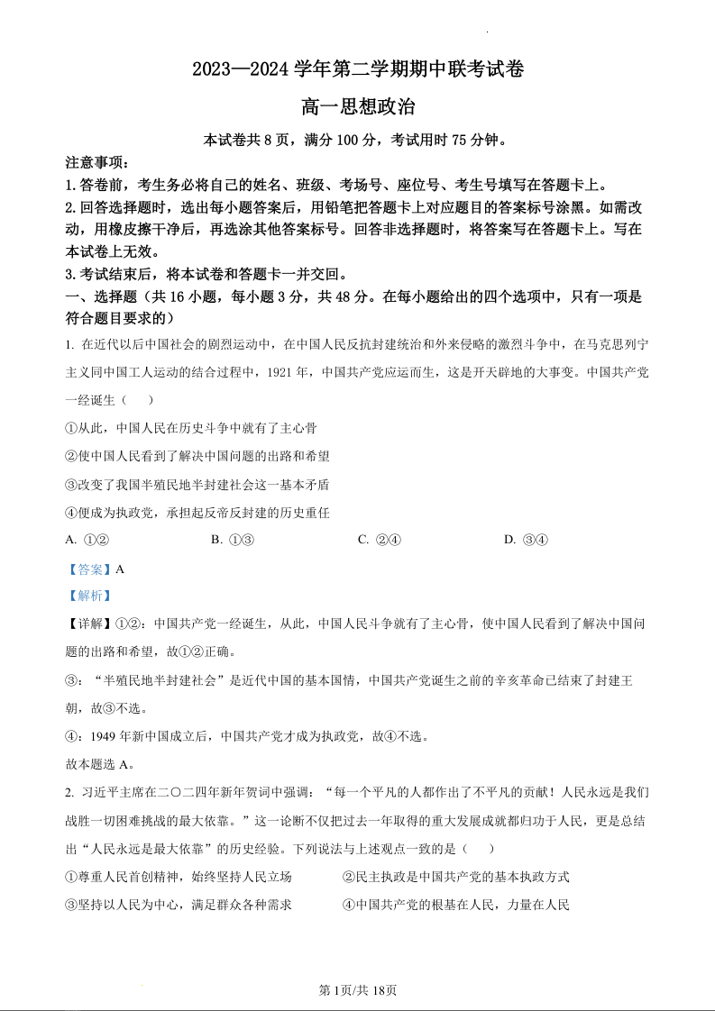 甘肃省天水市2023-2024学年高一下学期5月期中考试政治(精品解析版)