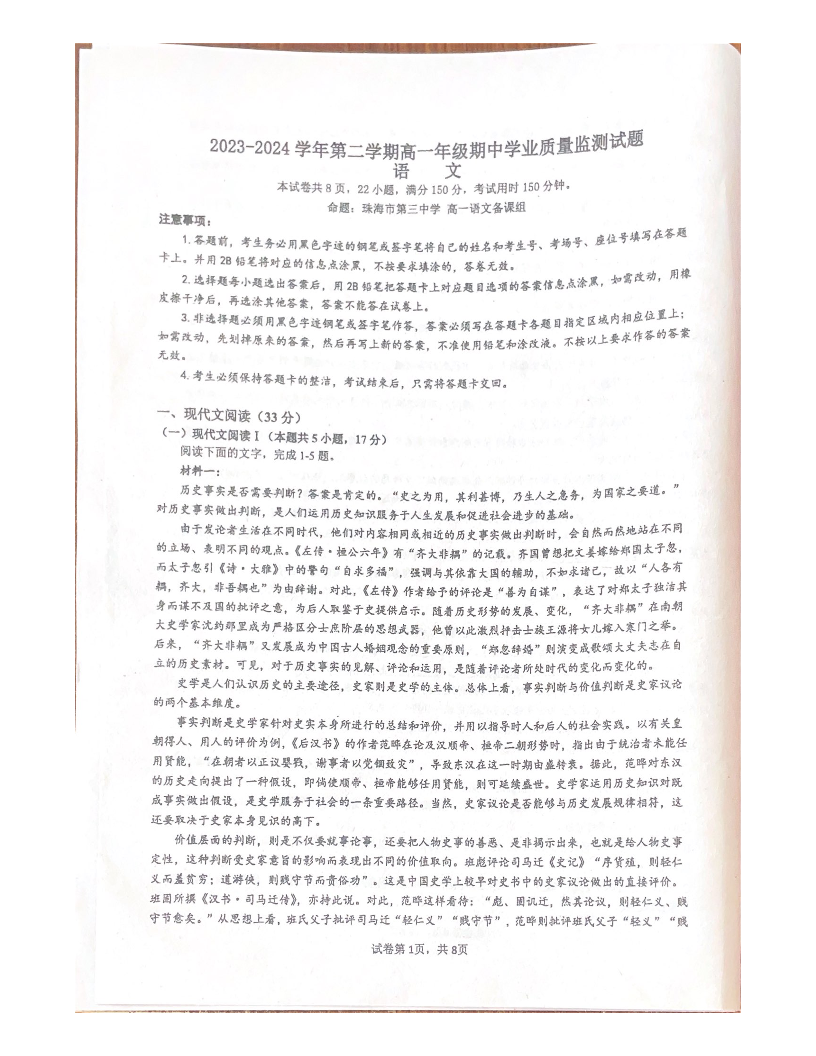 广东省珠海市六校联考2023-2024学年高一下学期4月期中考试语文