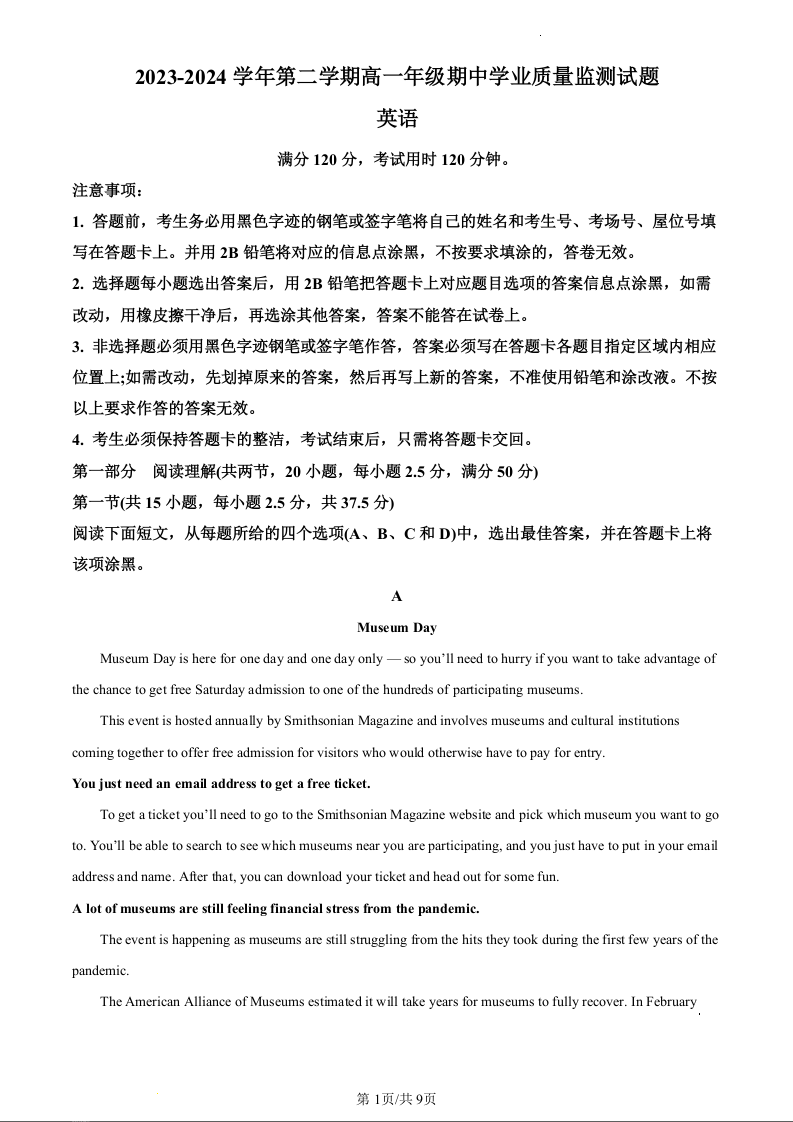 广东省珠海市六校联考2023-2024学年高一下学期4月期中考试英语(原卷版)