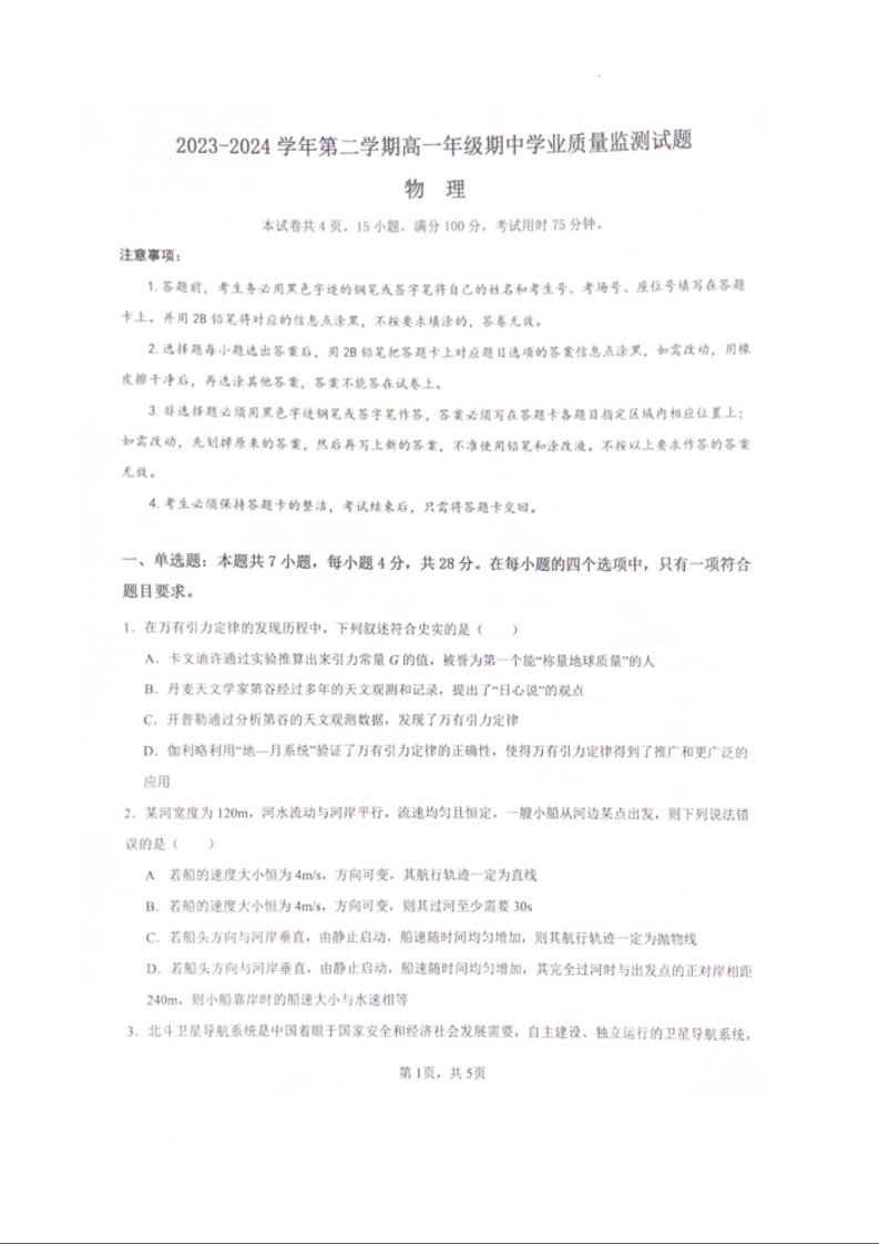 广东省珠海市六校联考2023-2024学年高一下学期4月期中考试物理