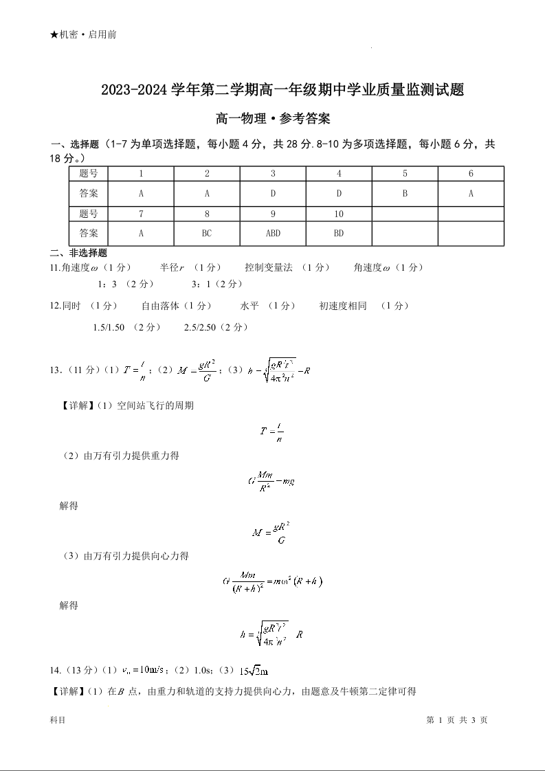 广东省珠海市六校联考2023-2024学年高一下学期4月期中考试物理答案