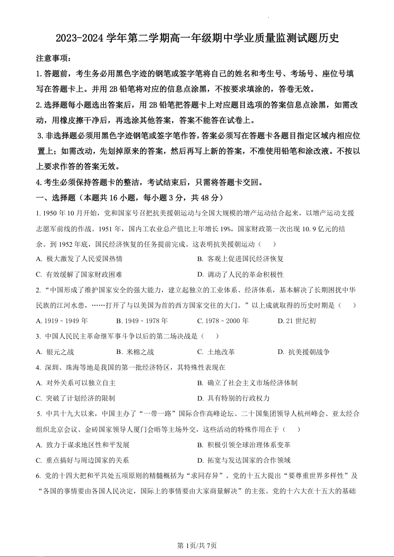 广东省珠海市六校联考2023-2024学年高一下学期4月期中考试历史(原卷版)