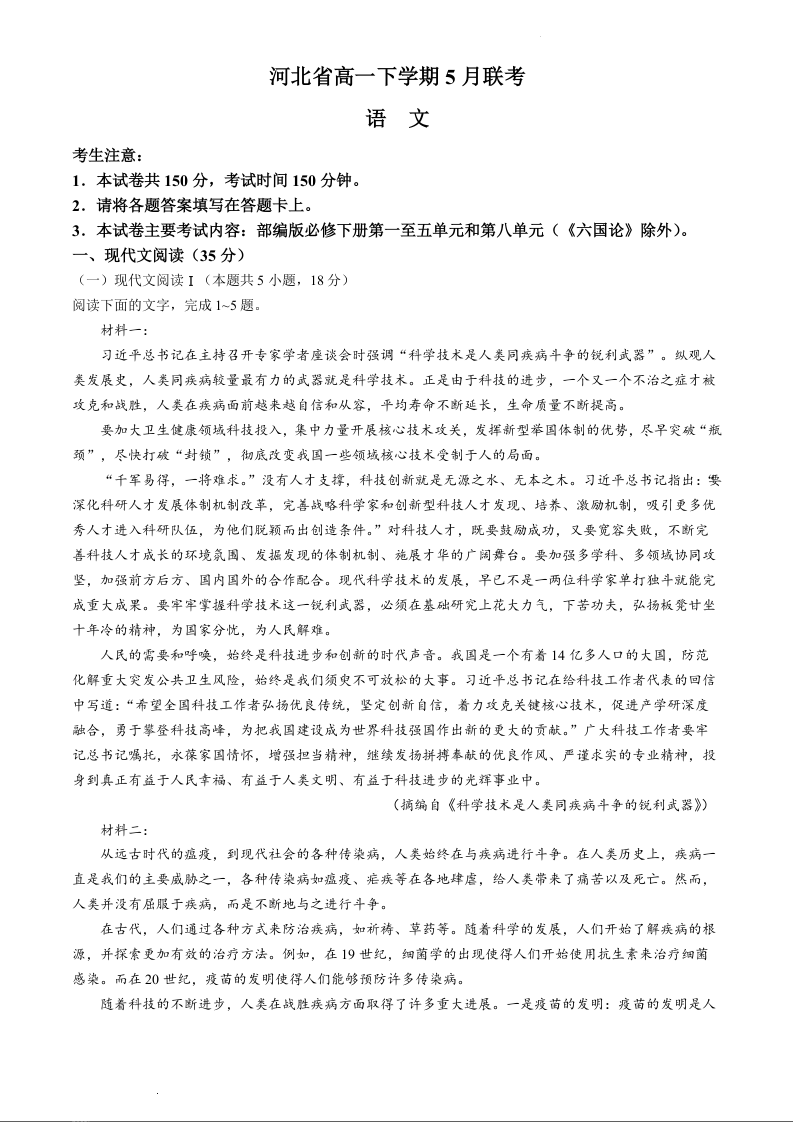 河北省保定市部分示范性高中2023-2024学年高一下学期5月期中考试语文+答案