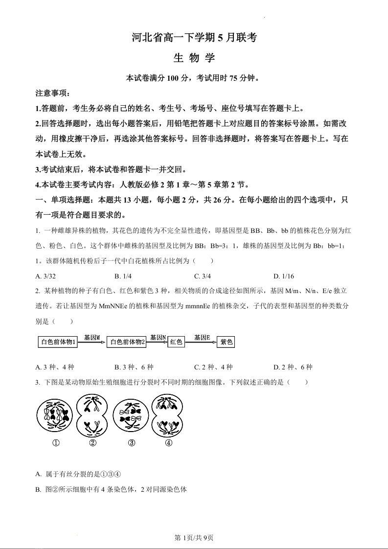 河北省保定市部分示范性高中2023-2024学年高一下学期5月期中考试生物(原卷版)