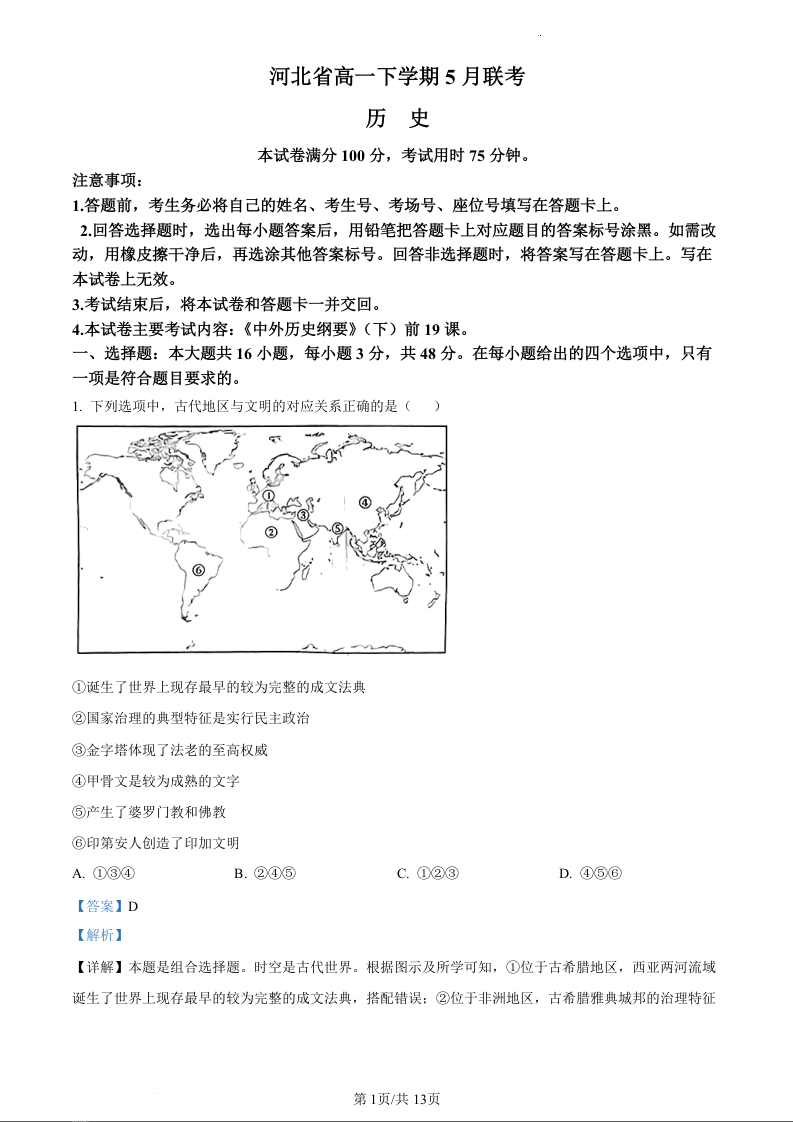 河北省保定市部分示范性高中2023-2024学年高一下学期5月期中考试历史(精品解析版)