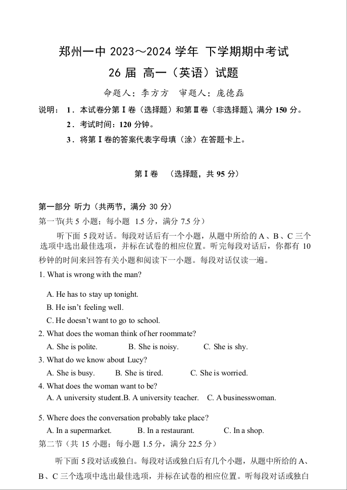 河南省郑州市第一中学2023-2024学年高一下学期期中考试英语
