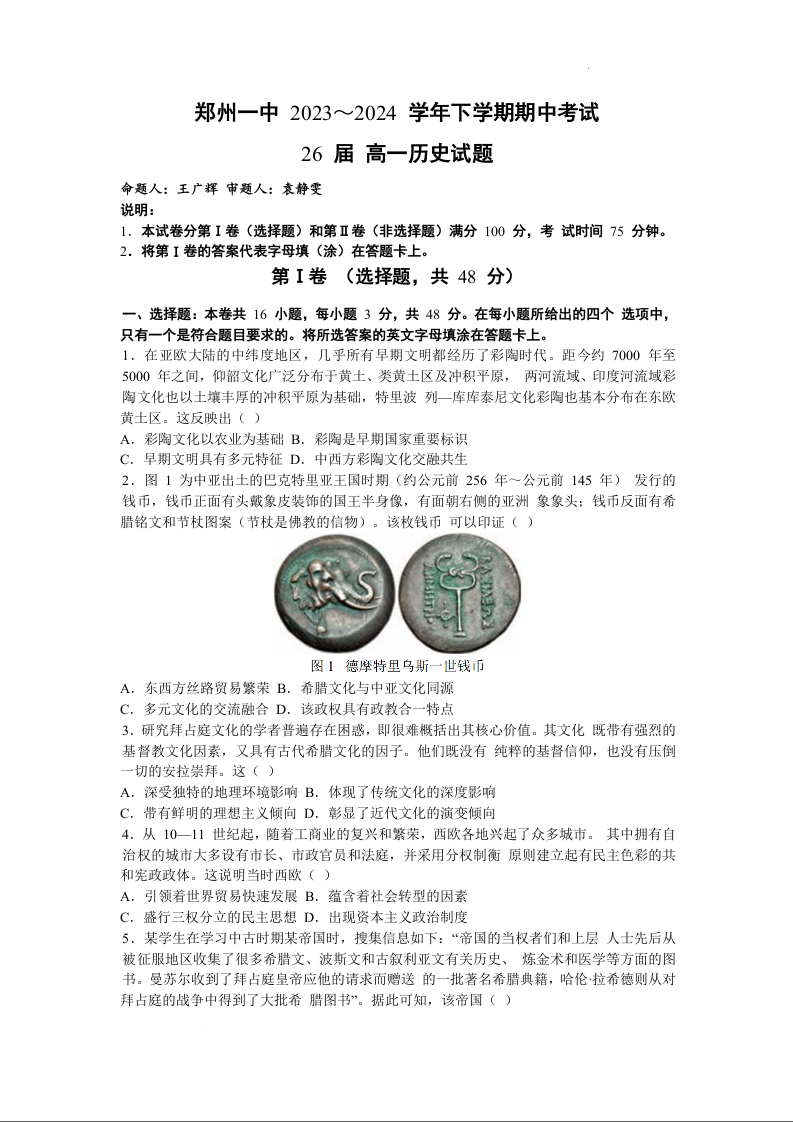 河南省郑州市第一中学2023-2024学年高一下学期期中考试历史+答案