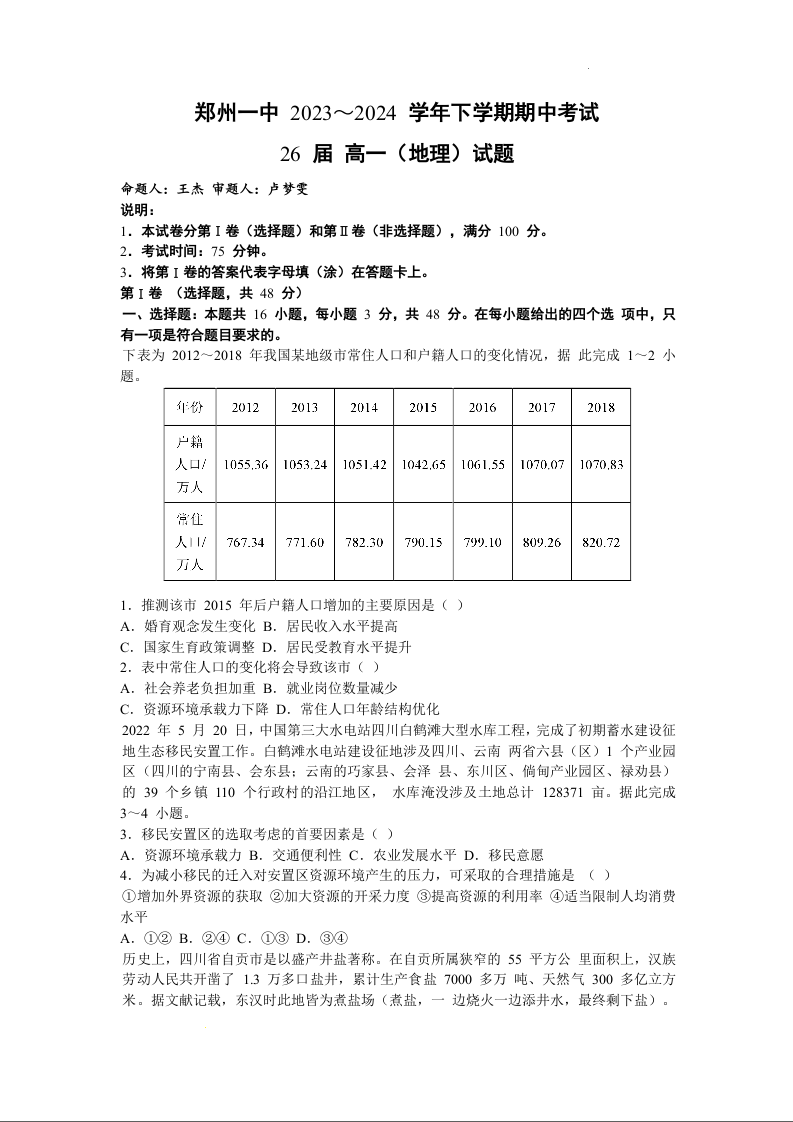 河南省郑州市第一中学2023-2024学年高一下学期期中考试地理+答案