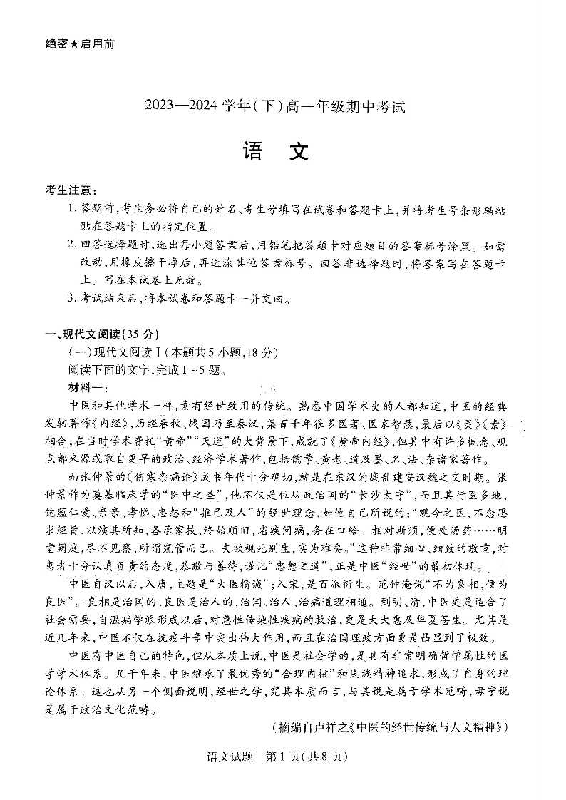 河南省部分学校2023-2024学年高一下学期期中联考语文
