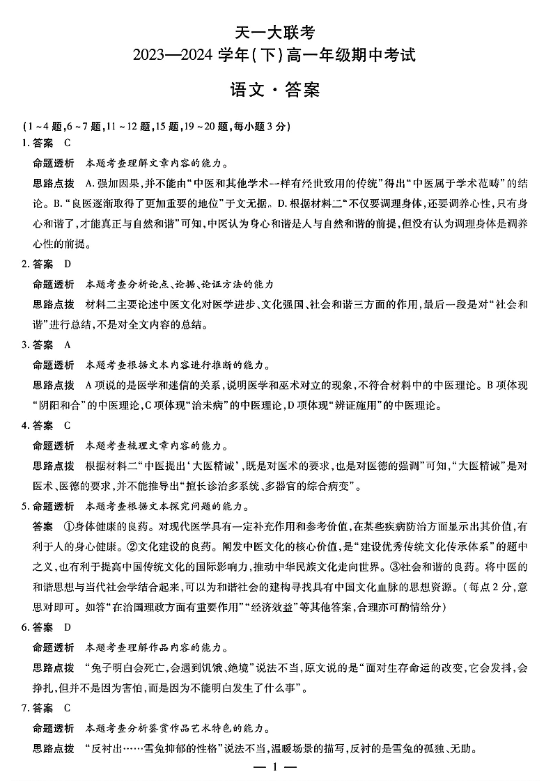 河南省部分学校2023-2024学年高一下学期期中联考语文答案
