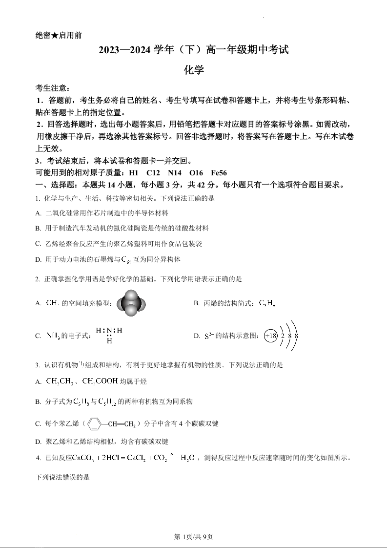 河南省部分学校2023-2024学年高一下学期期中联考化学(原卷版)
