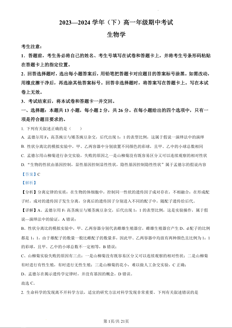 河南省部分学校2023-2024学年高一下学期期中联考生物(精品解析版)