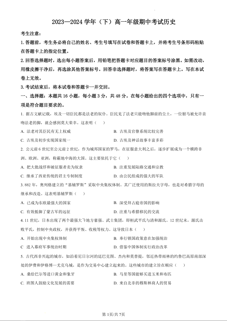 河南省部分学校2023-2024学年高一下学期期中联考历史(原卷版)