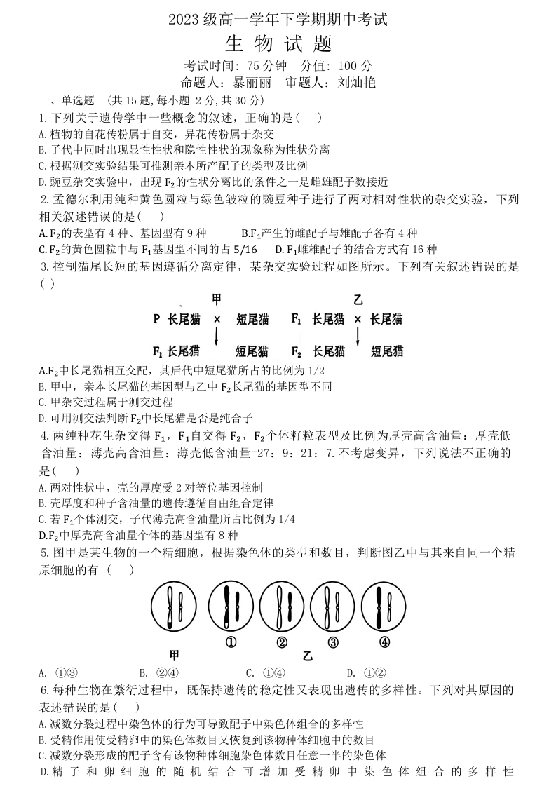 黑龙江省牡丹江市第一高级中学2023-2024学年高一下学期5月期中考试生物+答案