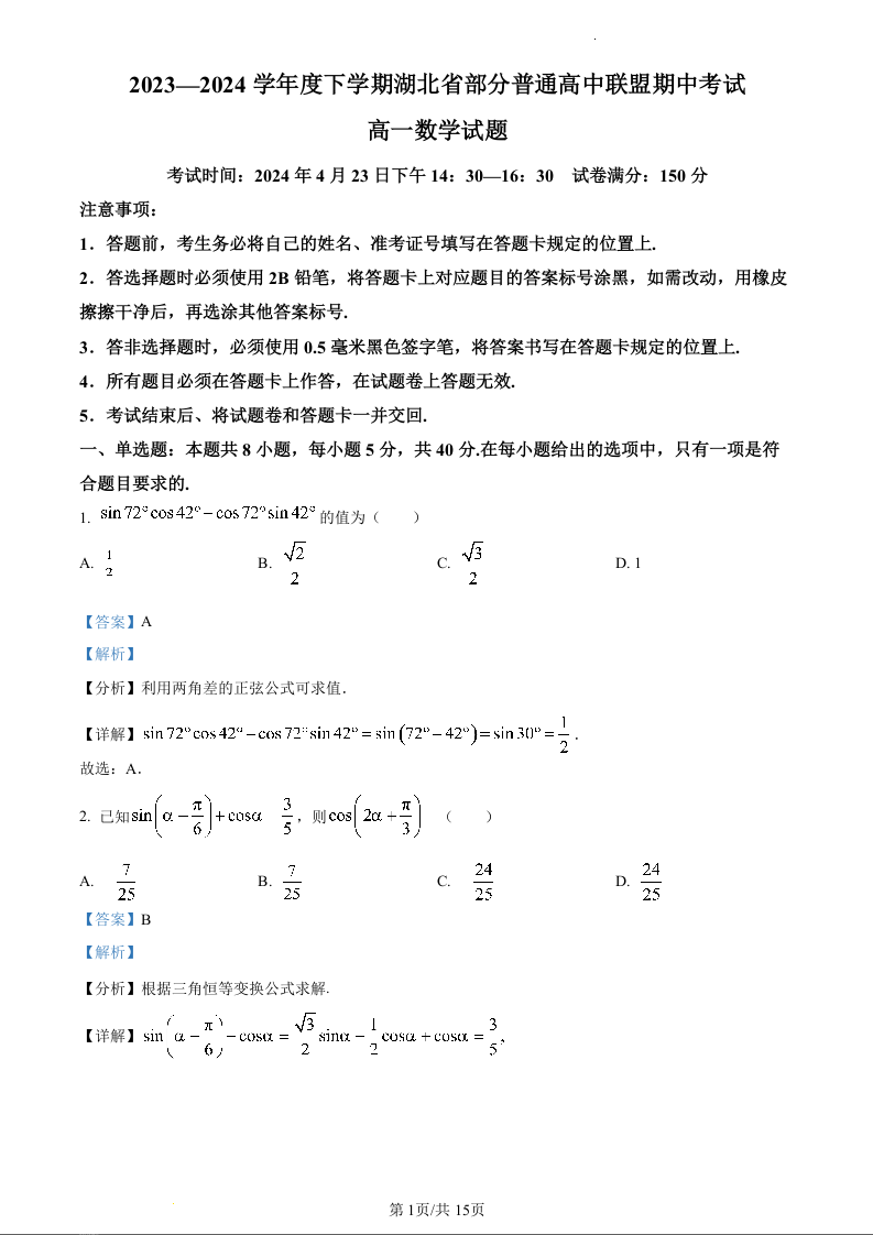 湖北省部分普通高中联盟2023-2024学年高一下学期期中考试数学(精品解析版)