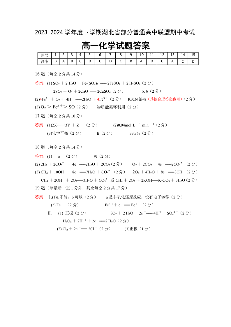 湖北省部分普通高中联盟2023-2024学年高一下学期期中考试化学答案