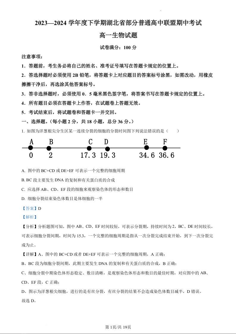 湖北省部分普通高中联盟2023-2024学年高一下学期期中考试生物(精品解析版)
