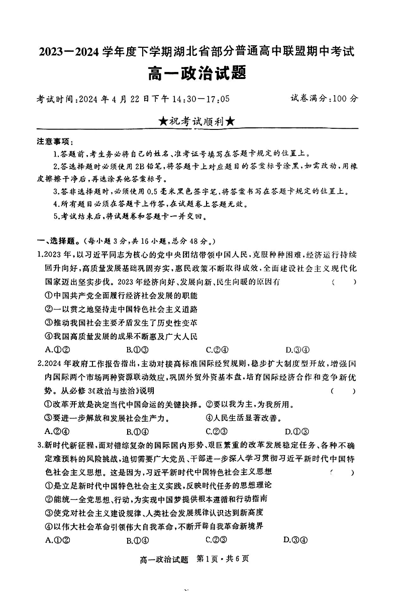 湖北省部分普通高中联盟2023-2024学年高一下学期期中考试政治