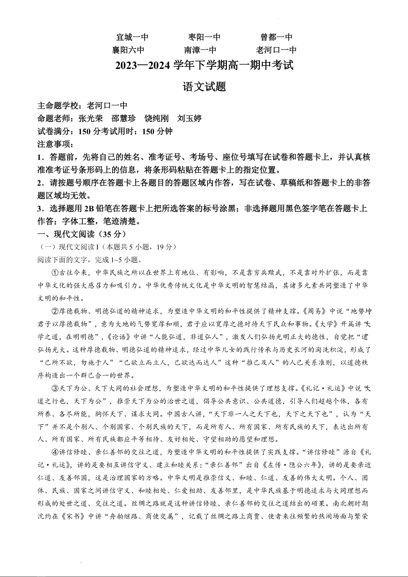 湖北省襄阳市鄂北六校联考2023-2024学年高一下学期期中考试语文+答案