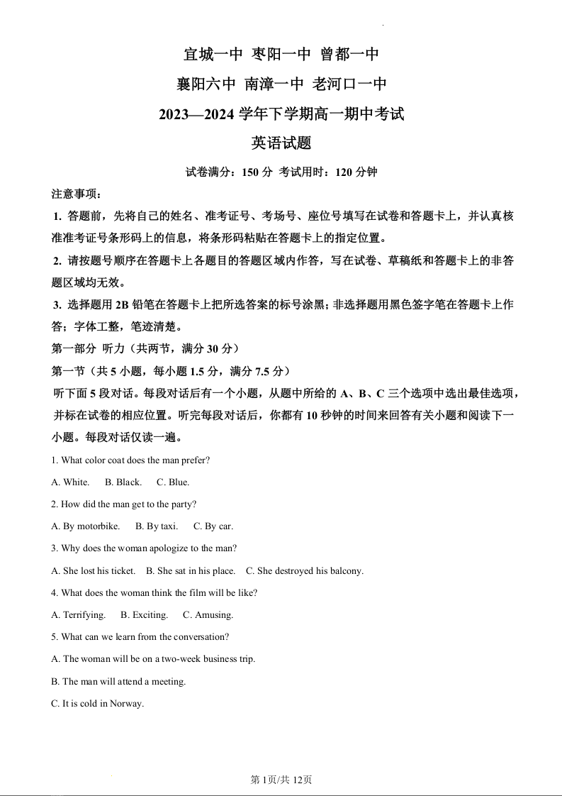 湖北省襄阳市鄂北六校联考2023-2024学年高一下学期期中考试英语(原卷版)