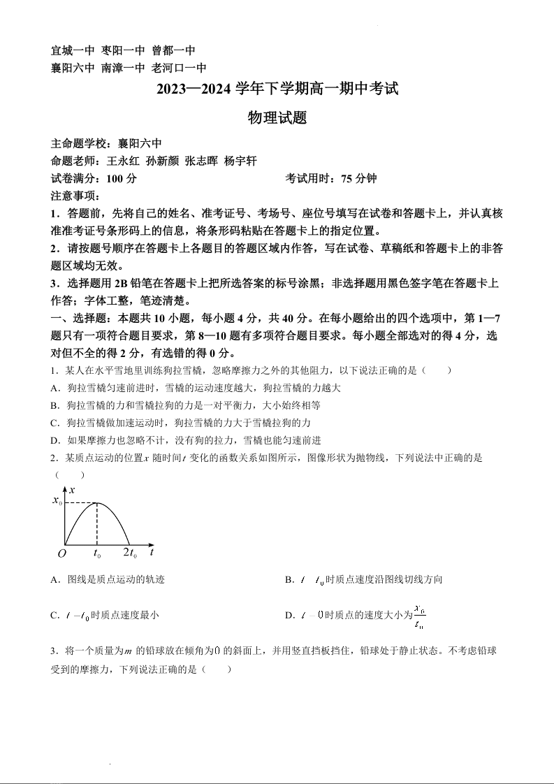 湖北省襄阳市鄂北六校联考2023-2024学年高一下学期期中考试物理+答案
