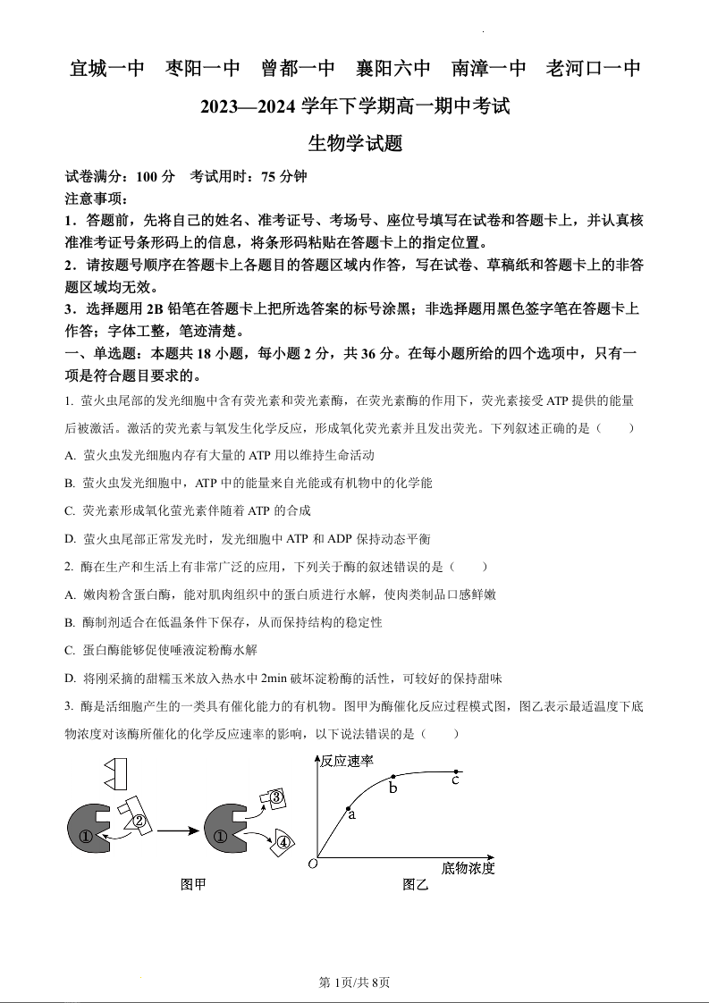 湖北省襄阳市鄂北六校联考2023-2024学年高一下学期期中考试生物(原卷版)