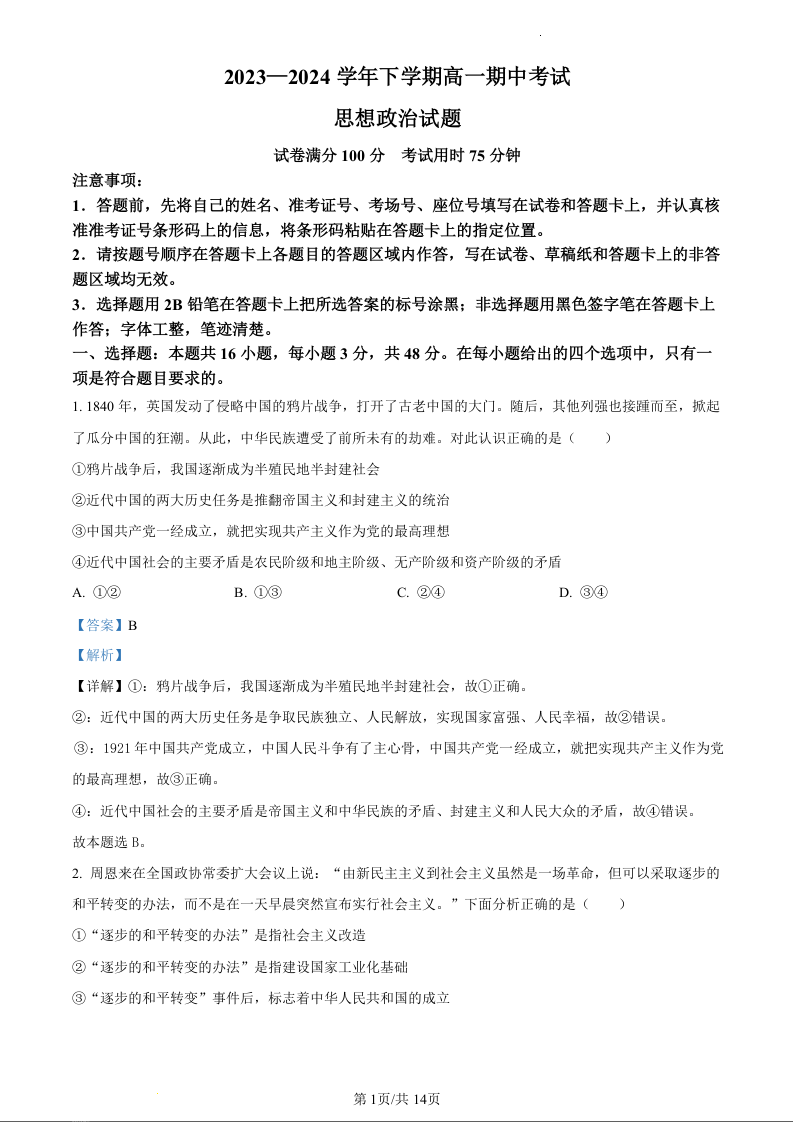 湖北省襄阳市鄂北六校联考2023-2024学年高一下学期期中考试政治(精品解析版)
