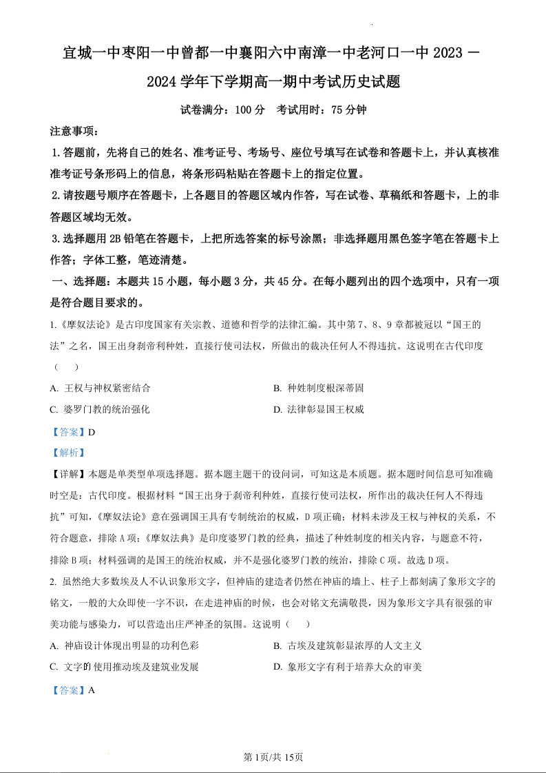 湖北省襄阳市鄂北六校联考2023-2024学年高一下学期期中考试历史(精品解析版)