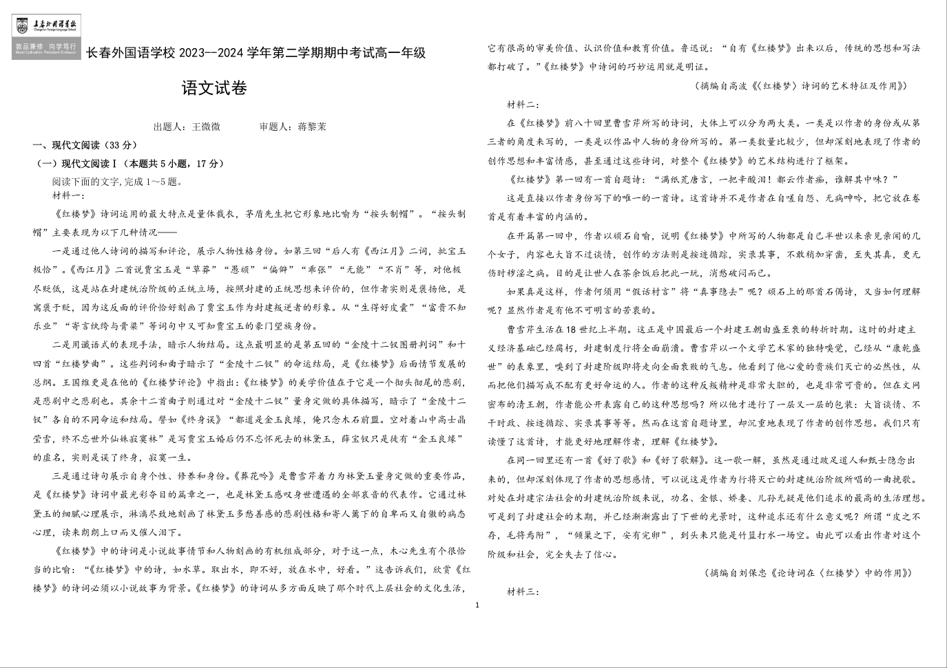 吉林省长春外国语学校2023-2024学年高一下学期5月期中考试语文+答案