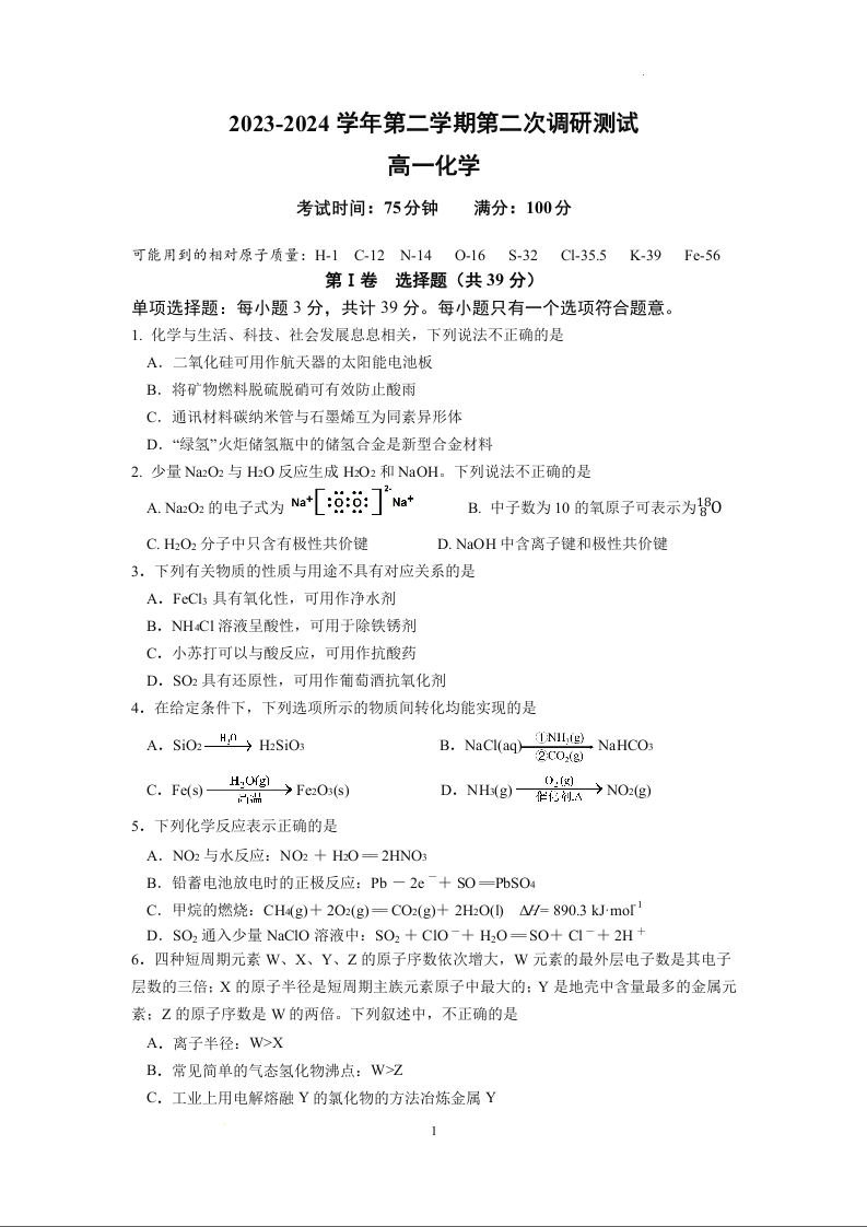 江苏省南京市六校联合体考试2023-2024学年高一下学期5月期中考试化学