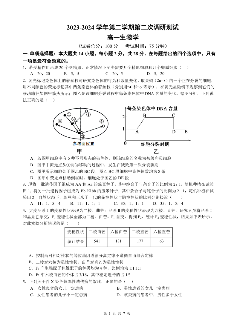 江苏省南京市六校联合体考试2023-2024学年高一下学期5月期中考试生物