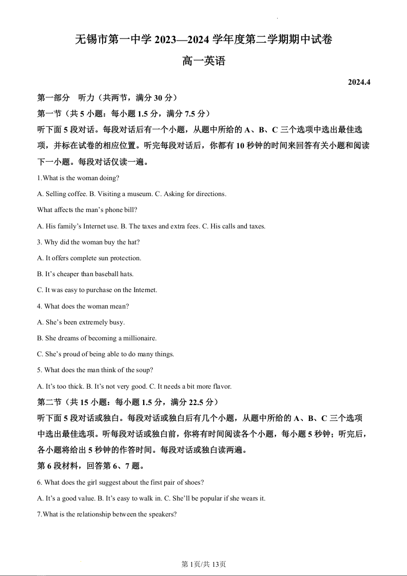 江苏省无锡市滨湖区无锡市第一中学2023-2024学年高一下学期4月期中考试英语(原卷版)