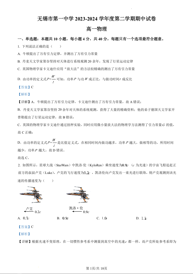 江苏省无锡市滨湖区无锡市第一中学2023-2024学年高一下学期4月期中考试物理(精品解析版)