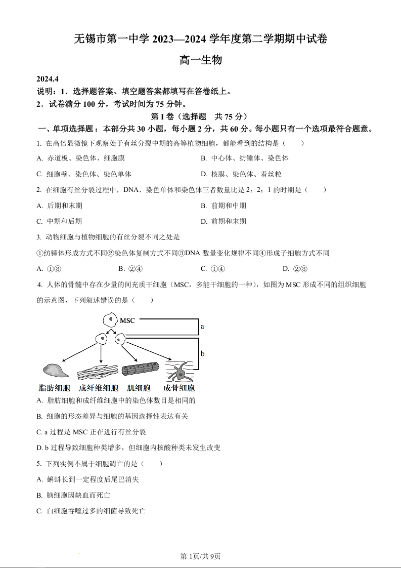 江苏省无锡市滨湖区无锡市第一中学2023-2024学年高一下学期4月期中考试生物(原卷版)