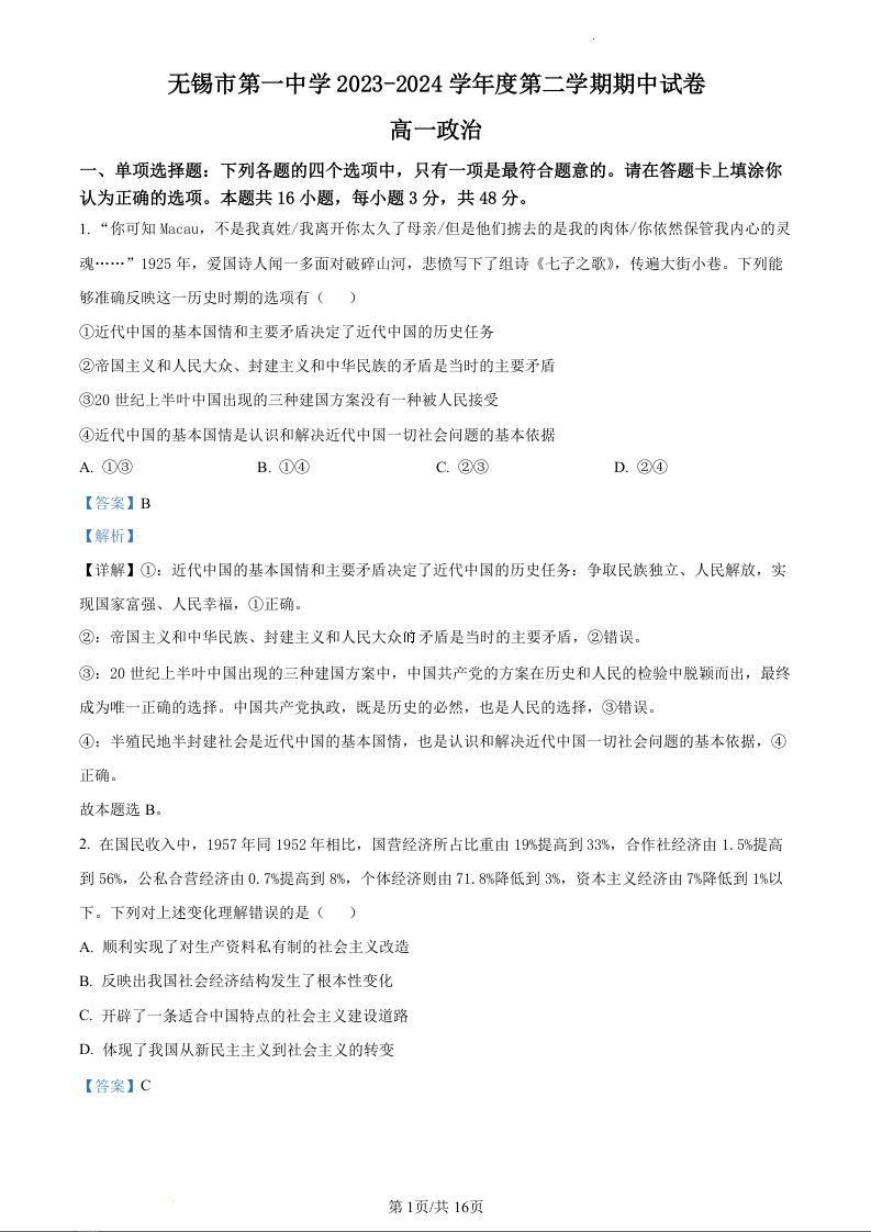 江苏省无锡市滨湖区无锡市第一中学2023-2024学年高一下学期4月期中考试政治(精品解析版)