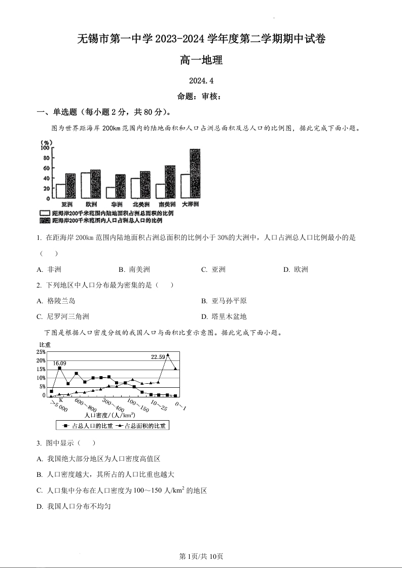 江苏省无锡市滨湖区无锡市第一中学2023-2024学年高一下学期4月期中考试地理(原卷版)