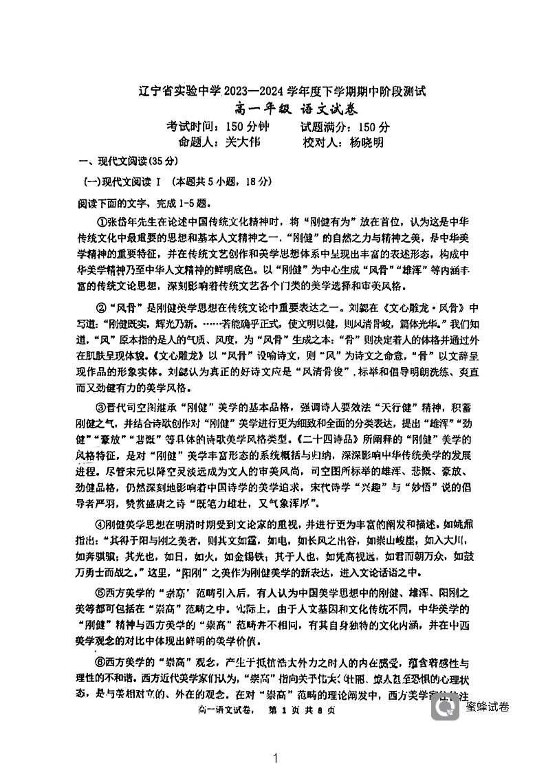 辽宁省实验中学2023-2024学年高一下学期期中考试语文