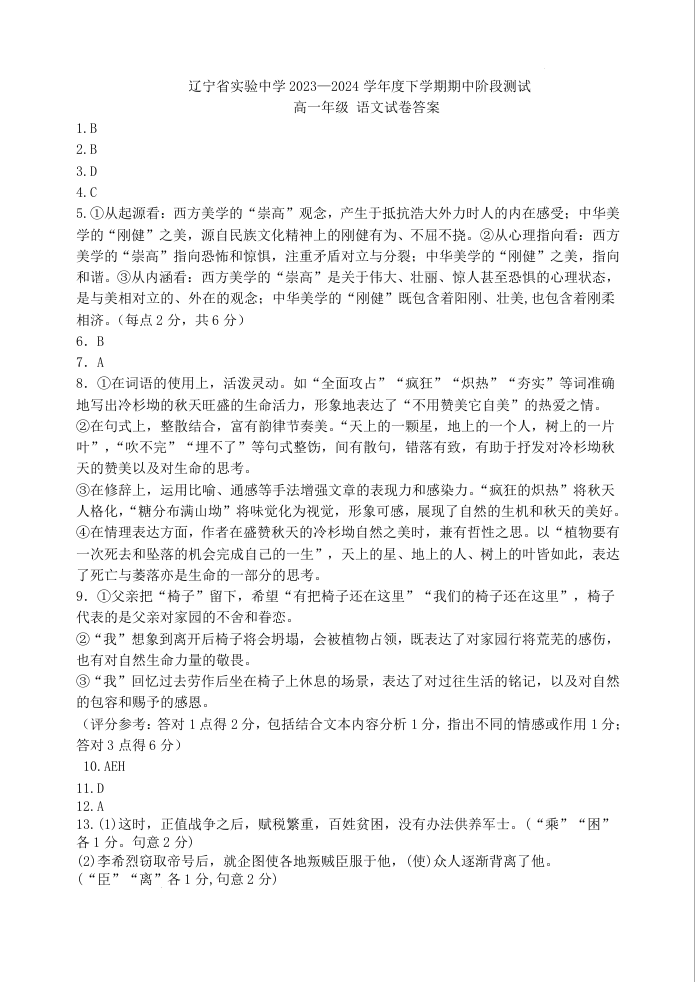辽宁省实验中学2023-2024学年高一下学期期中考试语文答案