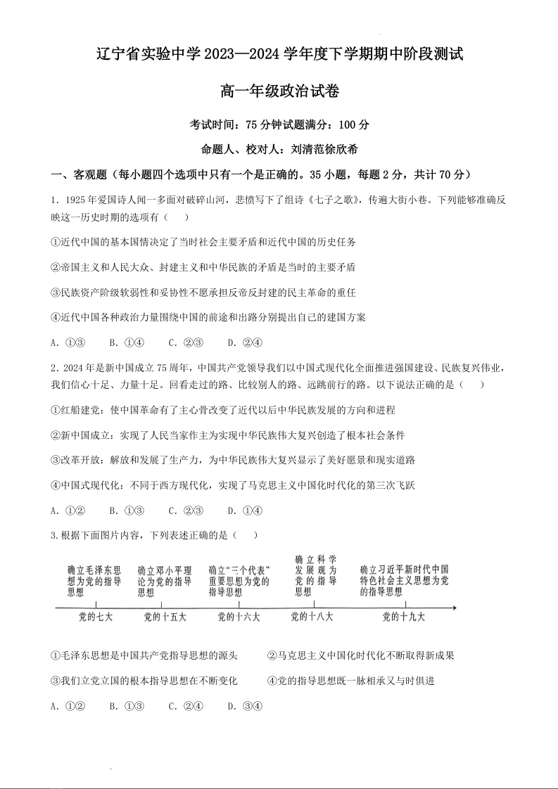 辽宁省实验中学2023-2024学年高一下学期期中考试政治+答案