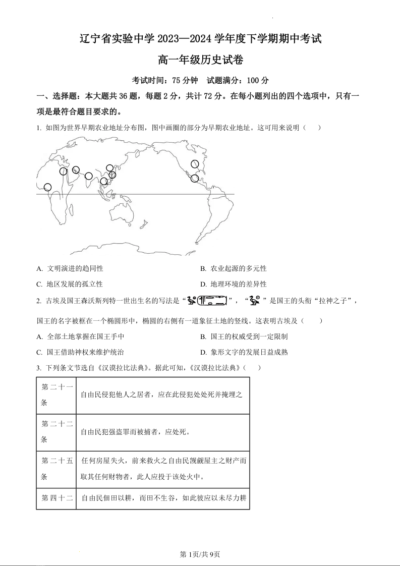 辽宁省实验中学2023-2024学年高一下学期期中考试历史(原卷版)