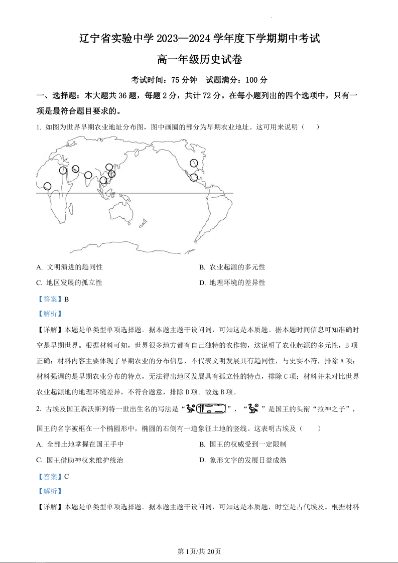 辽宁省实验中学2023-2024学年高一下学期期中考试历史(精品解析版)