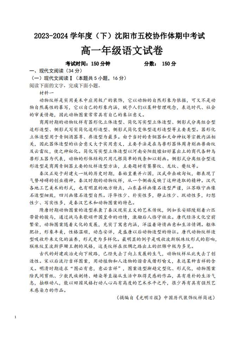 沈阳市五校协作体2023-2024学年度高一下学期期中考试 语文