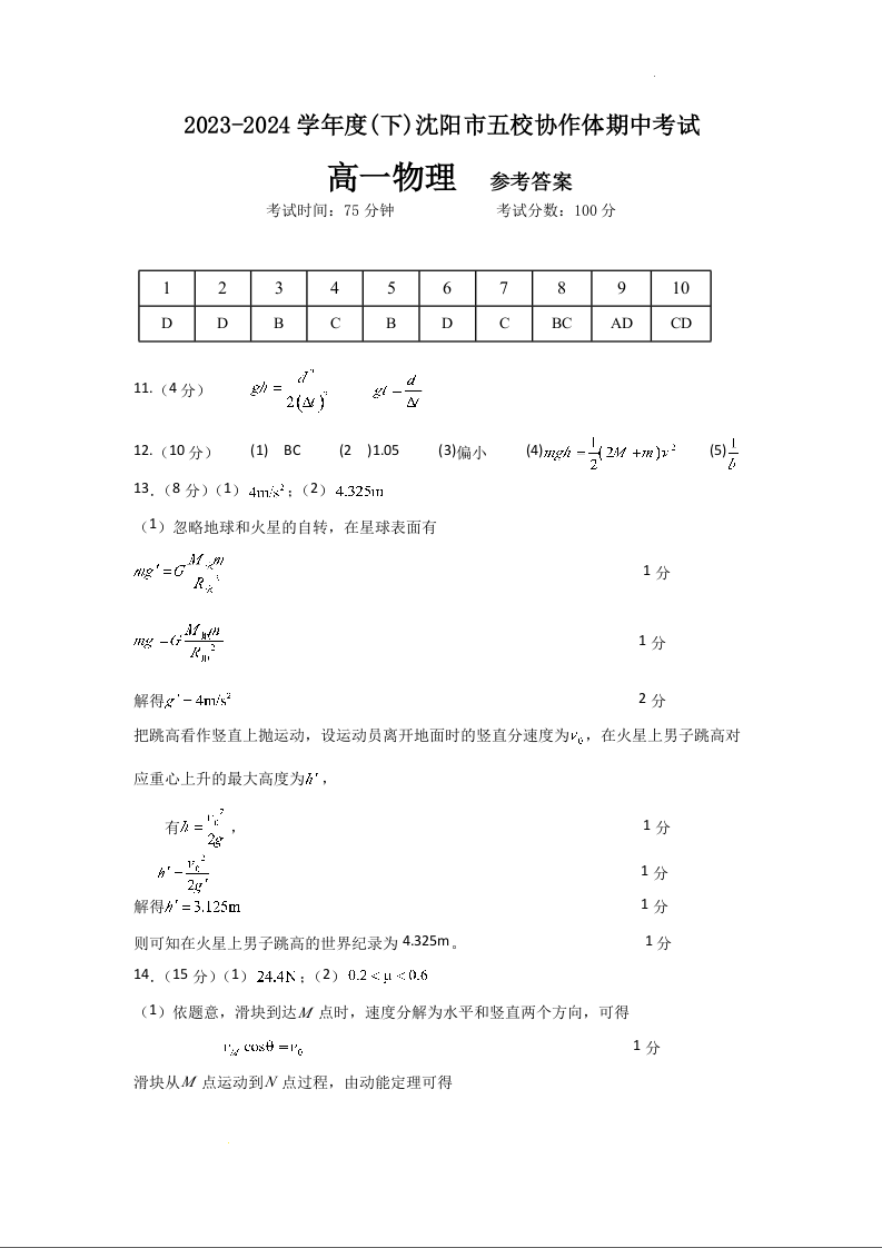 辽宁省沈阳市省重点中学五校联考2023-2024学年高一下学期5月期中考试物理答案